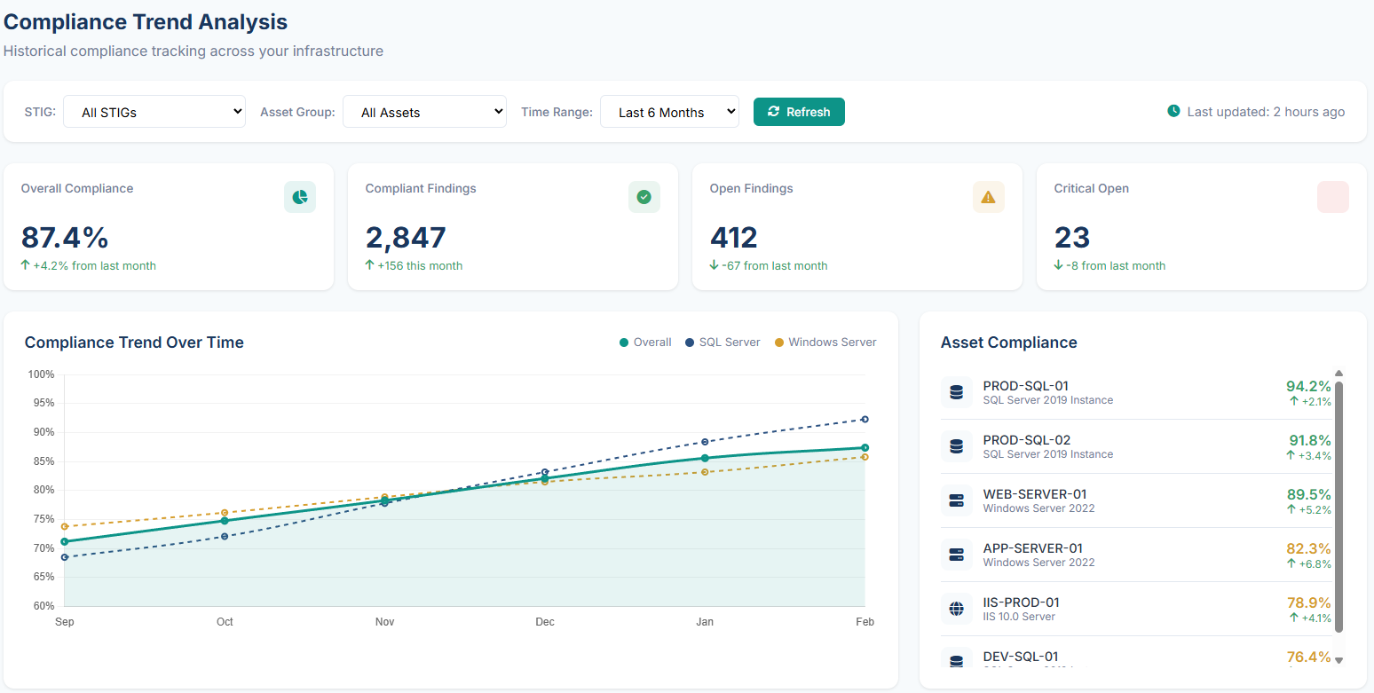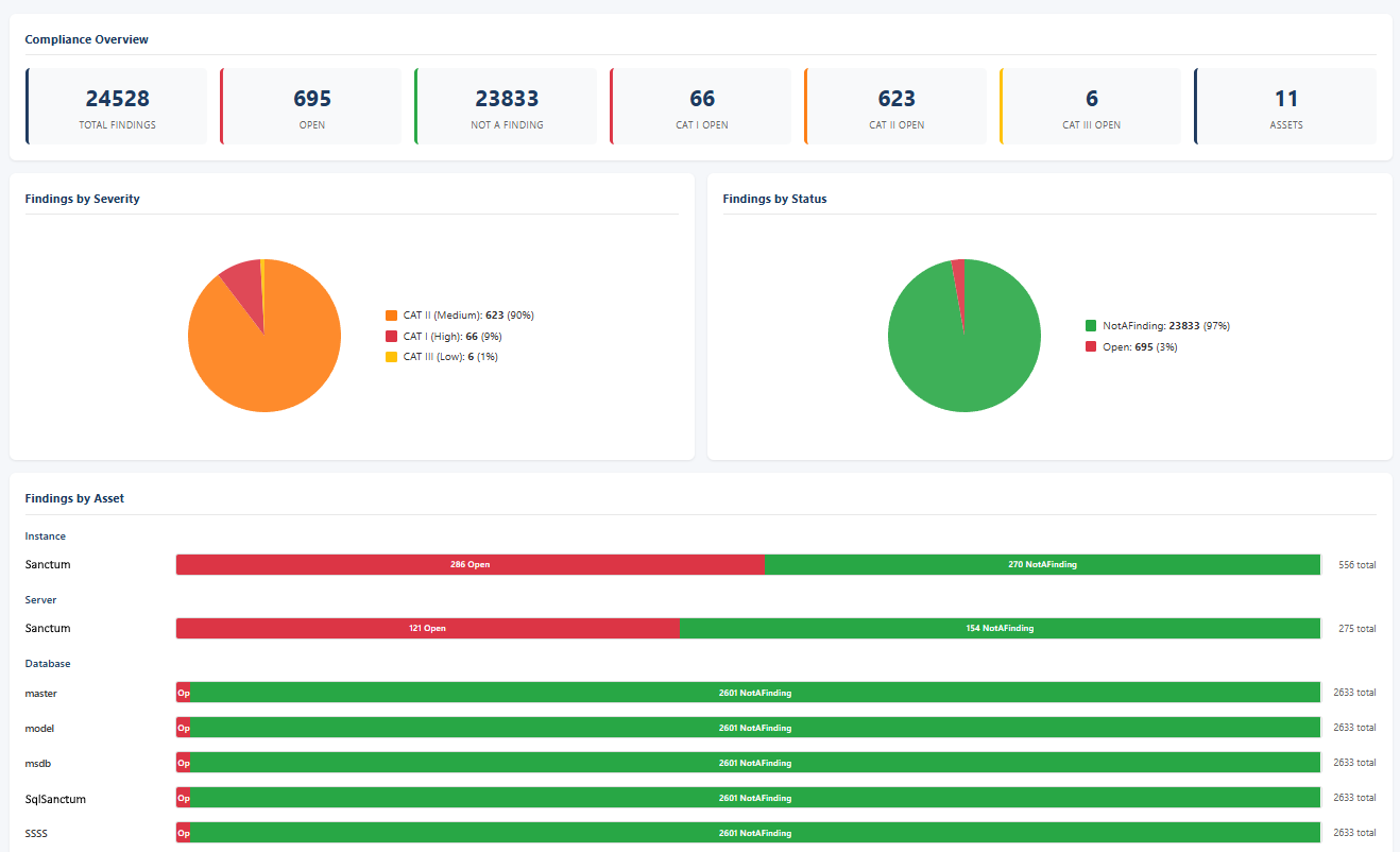 Unlike some community tools, which produce static, point-in-time reports, StigSanctum stores scan results in a centralized SQL Server database. This means: