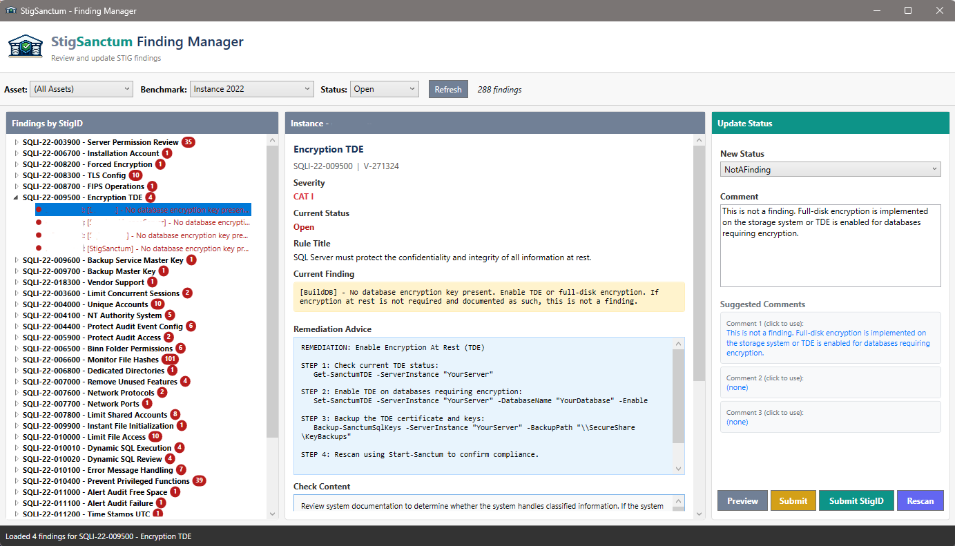 Add your SQL Server instances and Windows servers to StigSanctum. The system automatically detects applicable STIG benchmarks based on version and configuration, or use the GUI to add STIGs manually to specific assets.